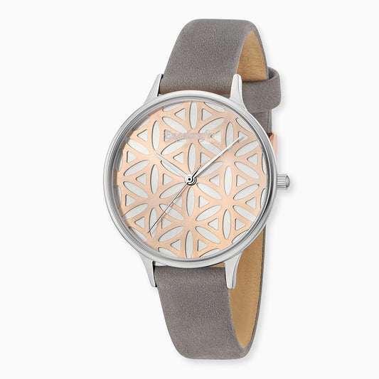 Uhr Edelstahl Lebensblume Bicolor mit Nubuk Lederband Grau