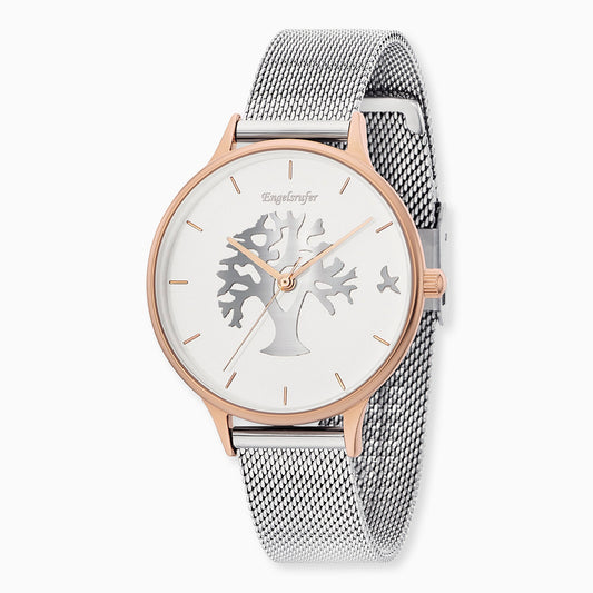 Uhr Edelstahl Lebensbaum Bicolor mit Edelstahl Mesh-Band