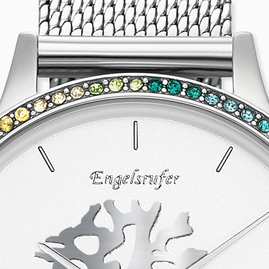 Uhr Edelstahl Lebensbaum mit Zirkonia Multicolor und Edelstahl Mesh-Band
