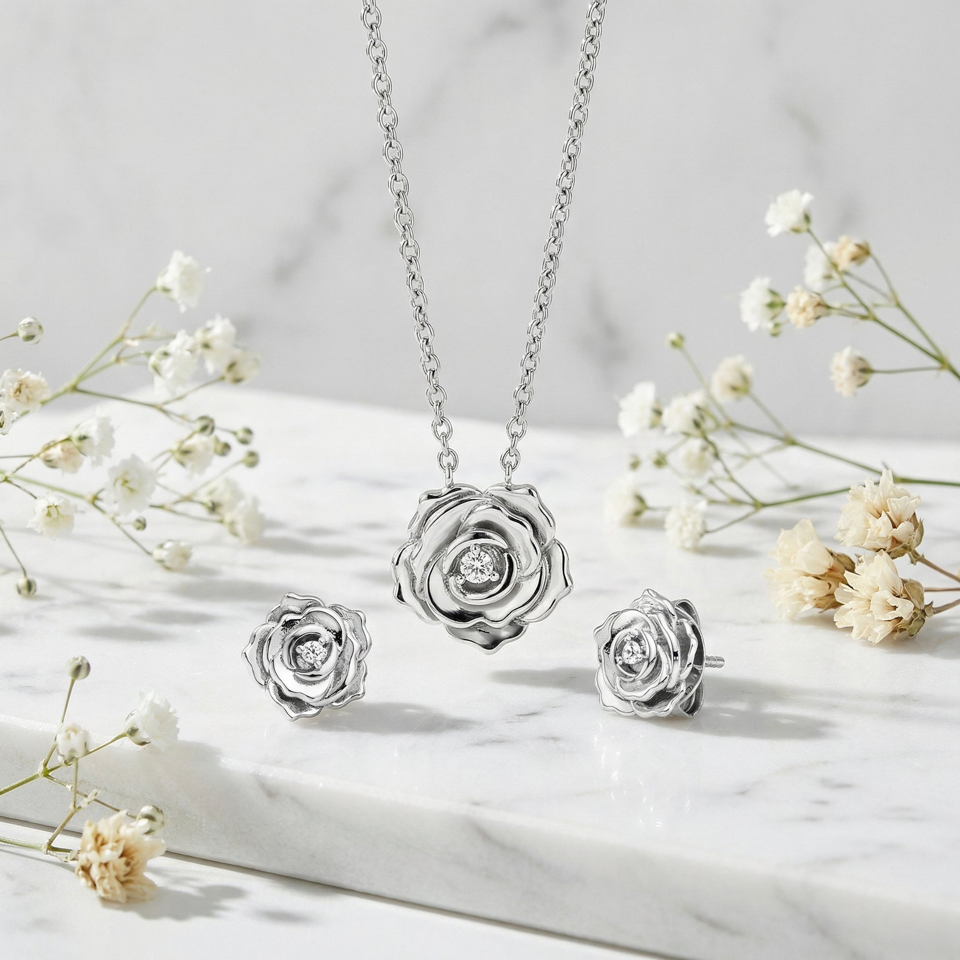 2er Schmuckset 925er Silber Halskette Ohrstecker Rose